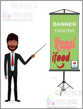 Banner impresso em lona no formato 100x300cm (largura x altura).